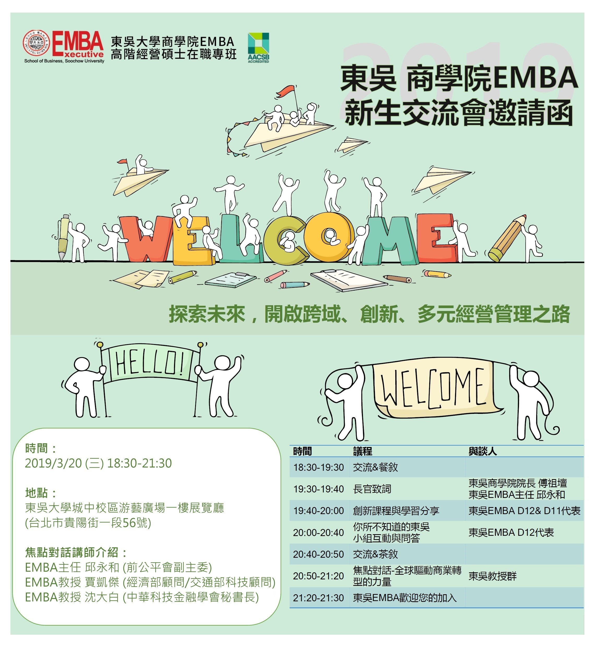 想知道在繁忙的工作中要如何兼顧學業?修課可以怎麼做彈性安排?東吳EMBA有哪些資源可以運用?揭密您所不知道的EMBA!開啟跨域、創新、多元經營管理之路! 探索未來,開啟跨域、創新、多元經營管理之路2019 東吳商學院EMBA新生交流會 時間: 2019/3/20 (三) 18:30-21:30地點: 東吳大學城中校區游藝廣場一樓展覽廳 (台北市貴陽街一段56號)出席回覆:https://goo.gl/forms/aFGL8yxaOHVCEvmz2